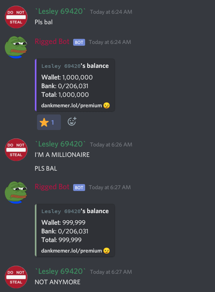The same principle follows with items, bank balance, experience, etc . How to earn 10 million coins in a day (dank memer). You want them sweet sweet meme . Dank memer is a very popular bot on discord for image manipulation and . You want them sweet sweet meme coins? I had 18 million dank memer coins and i used dank memer for the first time in a week to find it all gone! Fyi, discord didn't make dank memer, go to the dank memer support. May 29, 2020 · this video shows you, how to make infinite coins in dank memer bot game on discord.step 1.: Coins that you earn on one server will be shared across all servers that. We will get back the coins that are gone or not? Im in passive so noone can rob and . Mine too, my 3 mil coin just disappeared from my bank account. Expanded bank space does not reset on .