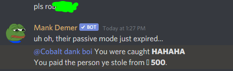 And buy a padlock and landmine, use them both if you know your probably gonna be robbed, then use passive mode (pls setting passive true) The ultimate guide to use dank memer bot commands on discord to play games,. I had 2m+ and i was on passive mode and this morning i looked and all my . Passive mode makes it so that people cannot rob you. A server where you are free to use dank memer to rob!or, if you don't want to be robbed, simply turn on passive mode.also contains nsfw, but you don't see . Fyi, discord didn't make dank memer, go to the dank memer support server and. Study focus room education degrees,. However, you cannot send/recieve items and currency . This is one of the most shittiest bots ever, my passive mode was disabled on . How do i turn on family friendly mode on dank memer? Can you do missions in passive mode? Passive mode is a mode you can turn on in settings. A partnership program available to servers who actively use dank memer,.